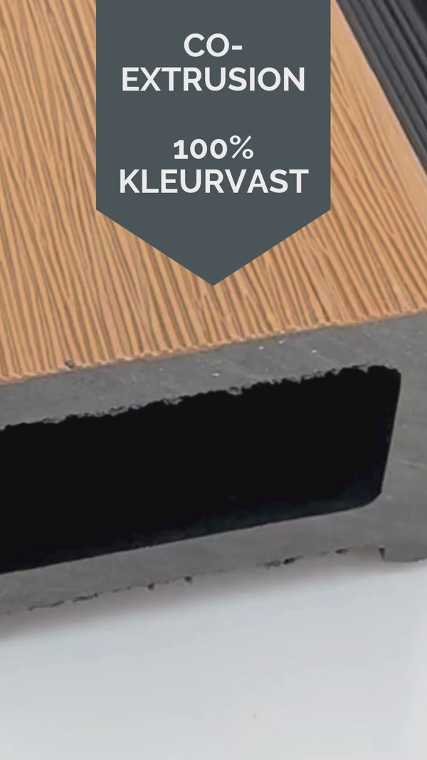 De planken zijn voorzien van een co-extrusion beschermlaag, die de schutting beschermt tegen vocht, UV-straling en weersinvloeden. Hierdoor blijft de kleur langdurig mooi en is schilderen of beitsen volledig overbodig. Geen rot, geen verkleuring, geen schimmel, alleen een schutting die er jaar na jaar strak en modern uitziet.